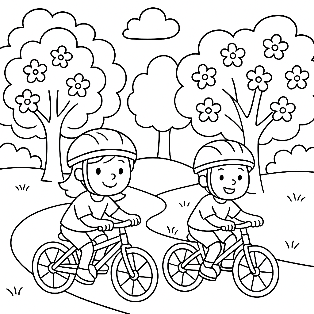 A simple coloring page featuring children riding bicycles on a tree-lined park path in spring. Perfect for kids (4-6) with large, bold outlines for a fun coloring experience.