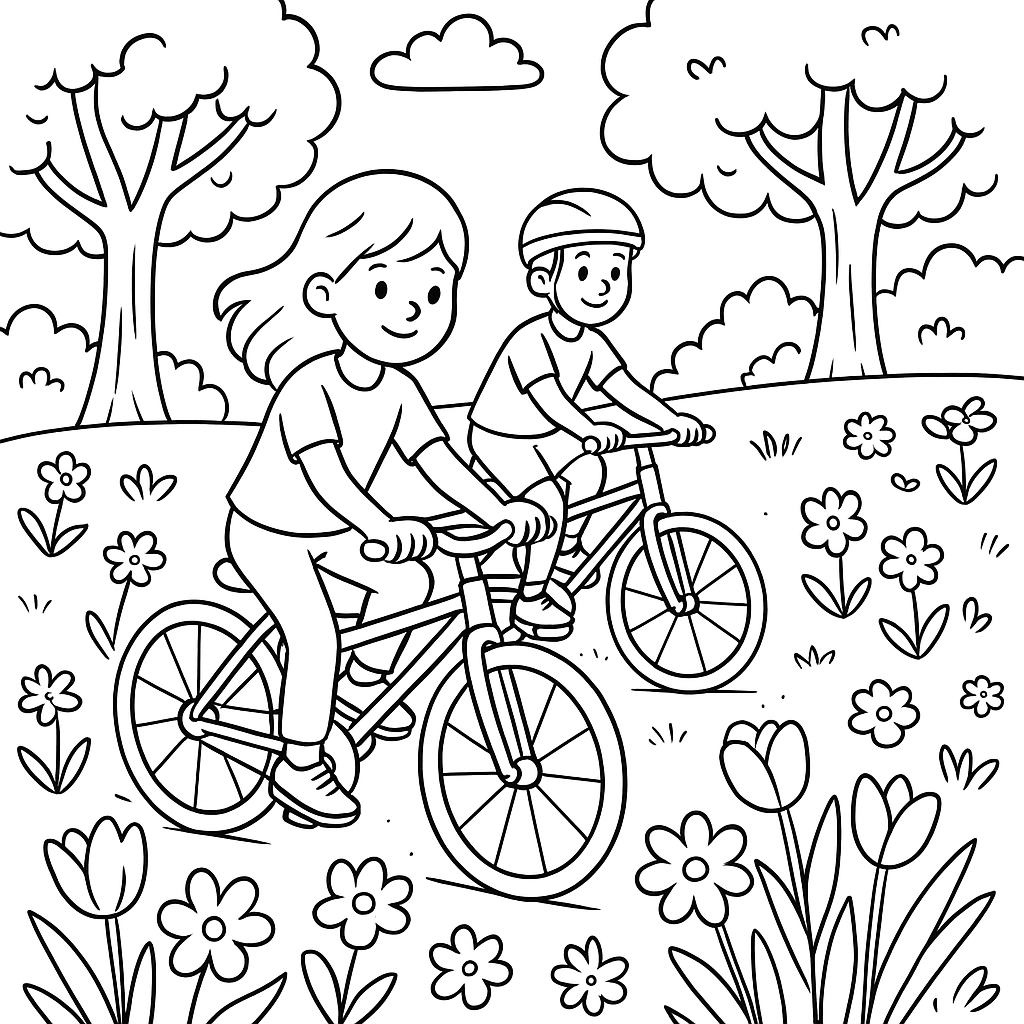 A medium coloring page featuring children riding bicycles on park path with spring flowers. Perfect for kids (6-9) with moderately detailed outlines for a fun coloring experience.