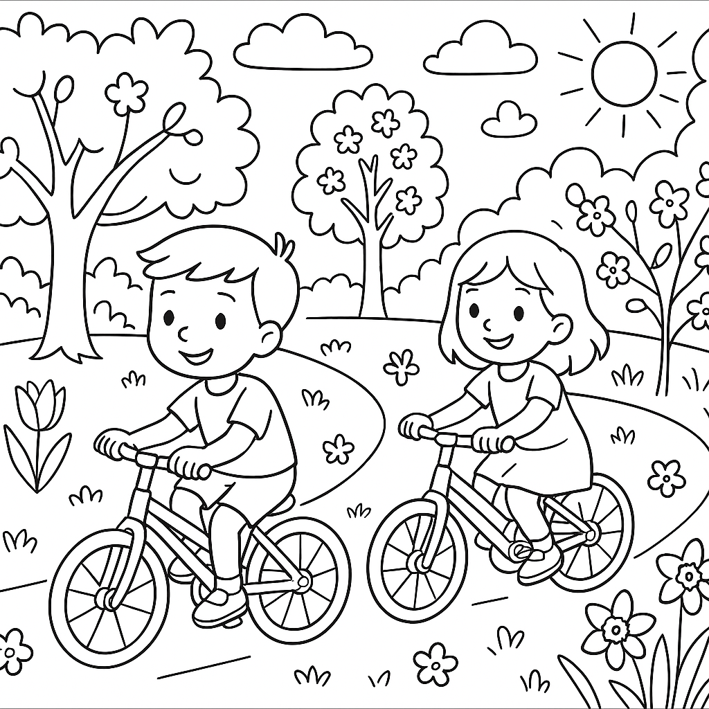 A medium coloring page featuring children riding bikes through spring park. Perfect for kids (6-9) with moderately detailed outlines for a fun coloring experience.