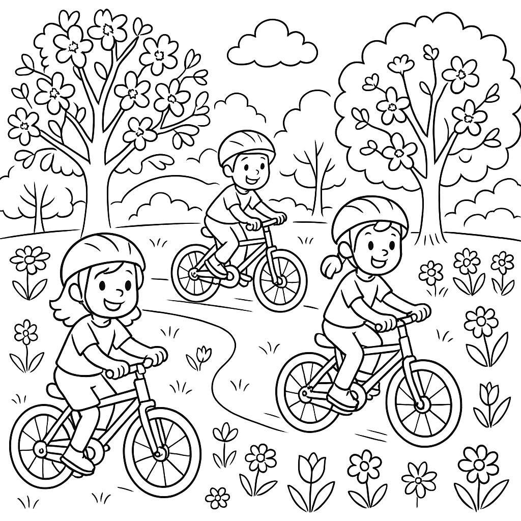 A medium coloring page featuring kids riding bicycles through a park with spring flowers. Perfect for kids (6-9) with moderately detailed outlines for a fun coloring experience.