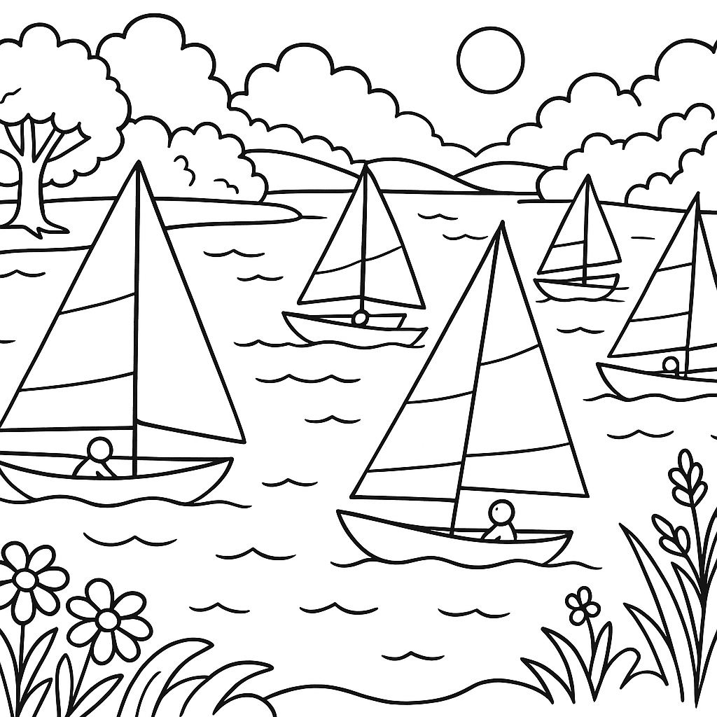 A medium coloring page featuring sailboat race on a lake with spring shoreline. Perfect for kids (6-9) with moderately detailed outlines for a fun coloring experience.