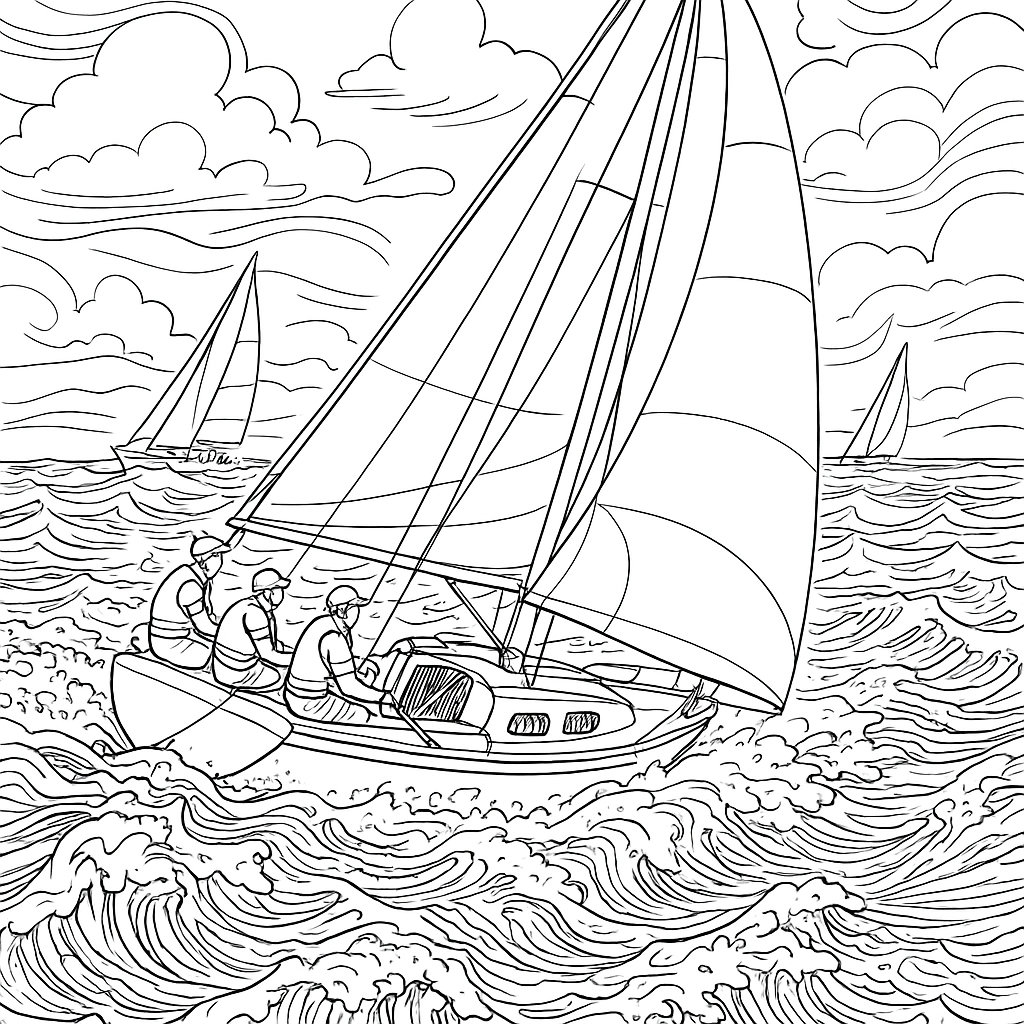 A detailed coloring page featuring sailboat racing on choppy ocean waves. Perfect for tweens (9-12) with intricate detail for a fun coloring experience.