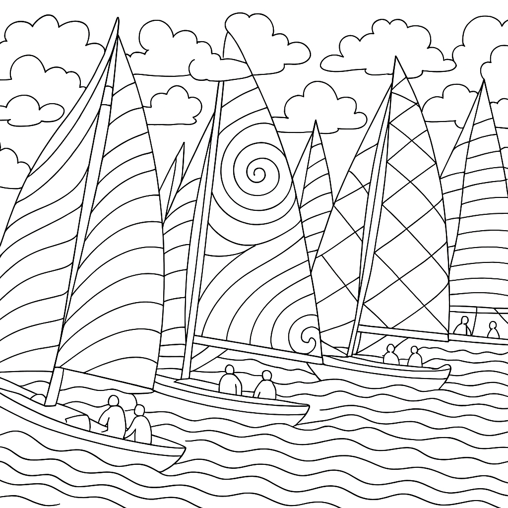 A detailed coloring page featuring sailboat racing regatta with multiple colorful sails. Perfect for tweens (9-12) with intricate detail for a fun coloring experience.