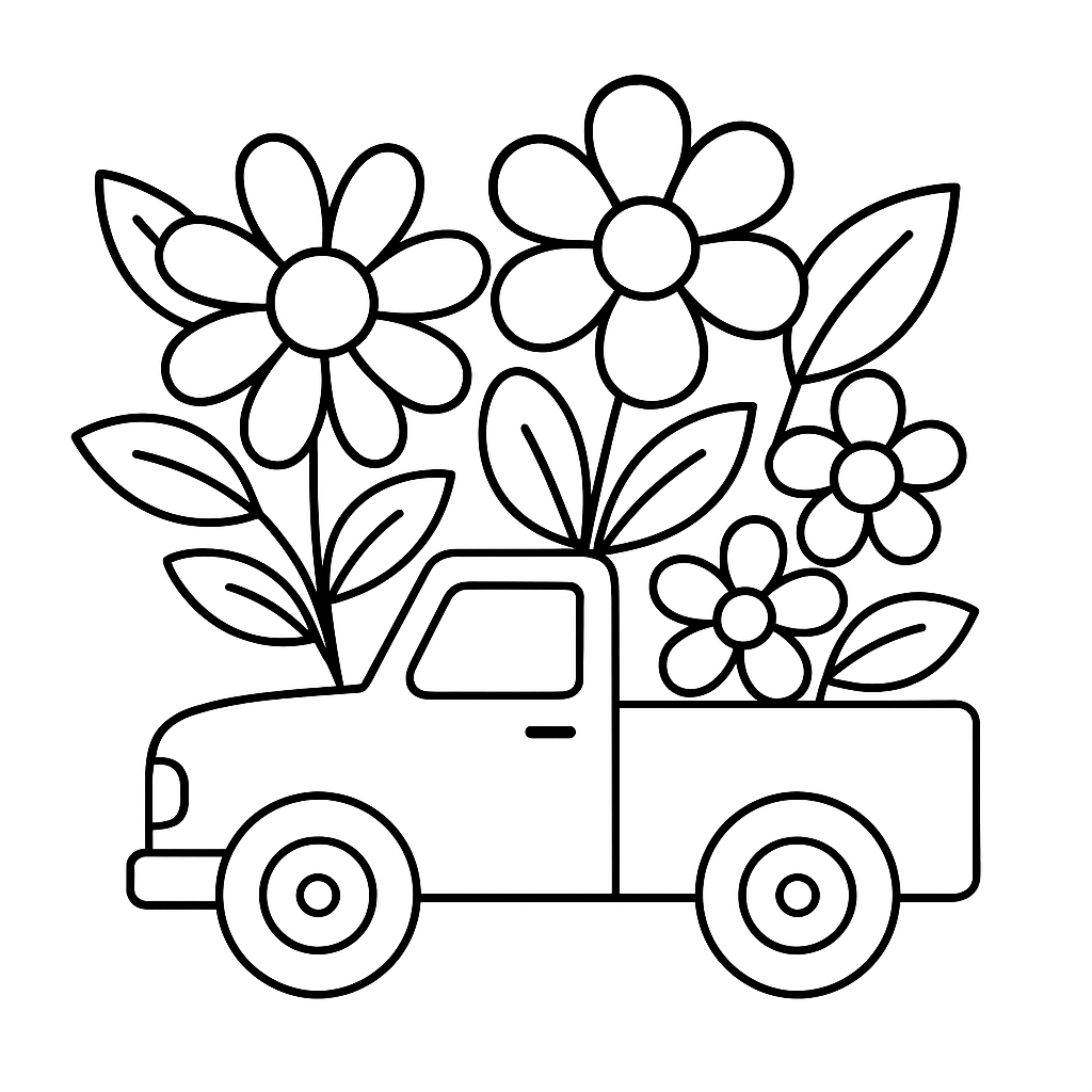 A simple coloring page featuring a flower delivery truck decorated with spring blooms. Perfect for toddlers (2-4) with large, bold outlines for a fun coloring experience.