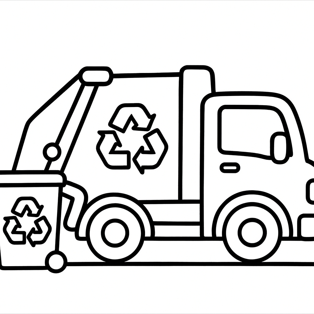 A simple coloring page featuring a garbage truck collecting recyclables. Perfect for toddlers (2-4) with large, bold outlines for a fun coloring experience.