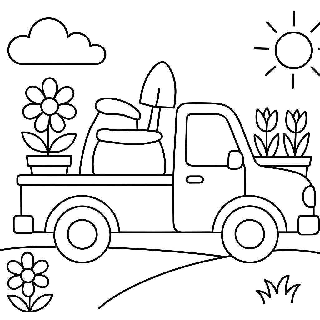 A simple coloring page featuring a pickup truck loaded with spring planting supplies. Perfect for kids (4-6) with large, bold outlines for a fun coloring experience.