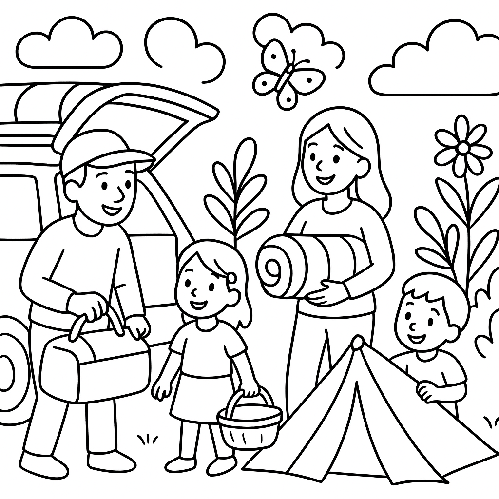 A medium coloring page featuring family loading car for spring camping trip. Perfect for kids (4-6) with moderately detailed outlines for a fun coloring experience.