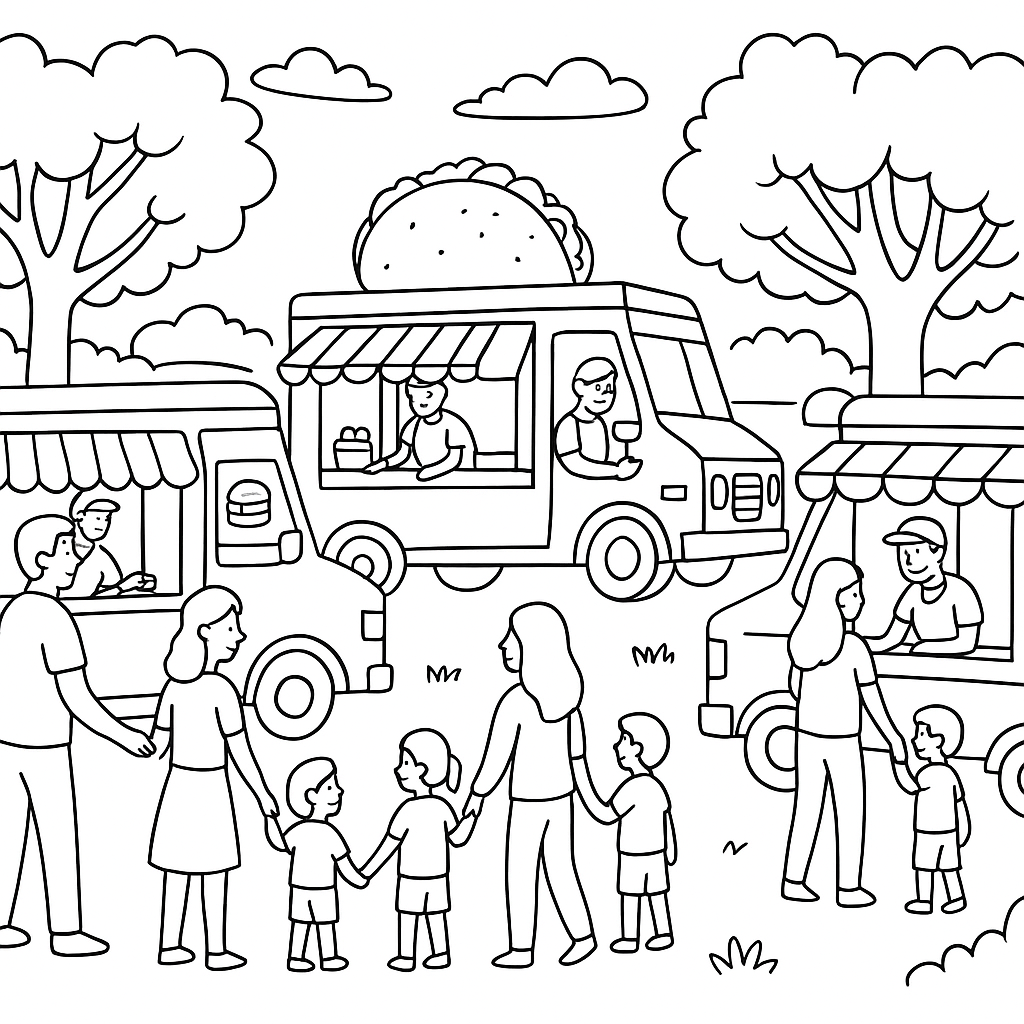 A medium coloring page featuring food truck festival in park with families ordering. Perfect for kids (6-9) with moderately detailed outlines for a fun coloring experience.