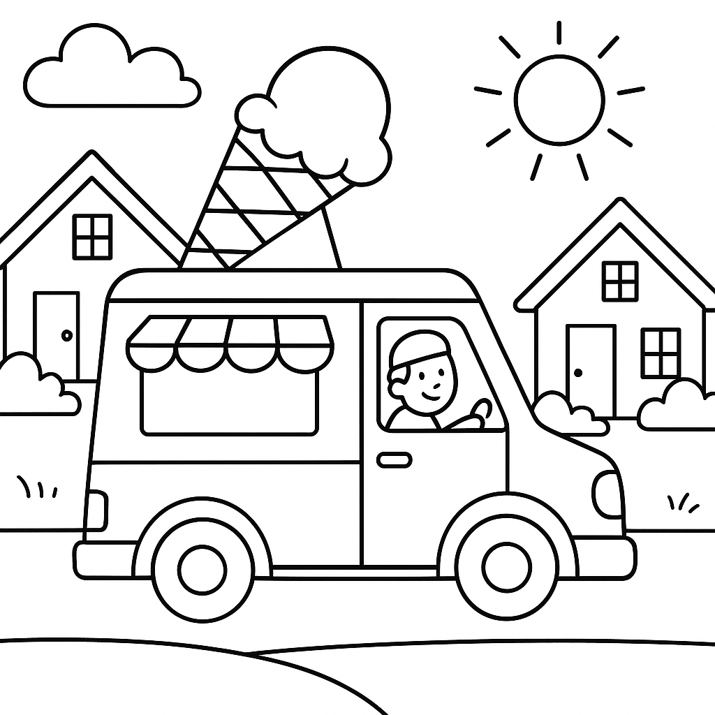 A simple coloring page featuring ice cream truck driving through neighborhood. Perfect for kids (4-6) with large, bold outlines for a fun coloring experience.
