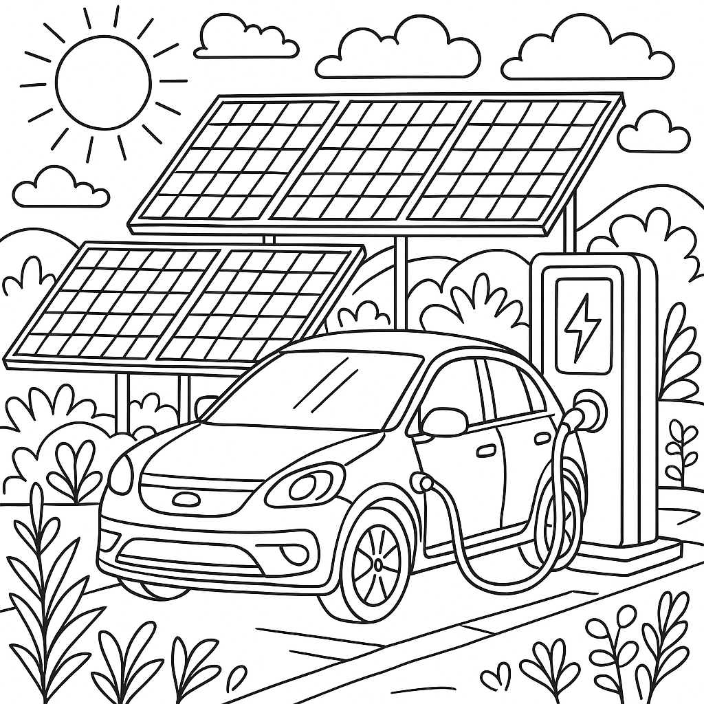 A detailed coloring page featuring electric car charging at solar power station. Perfect for tweens (9-12) with intricate detail for a fun coloring experience.