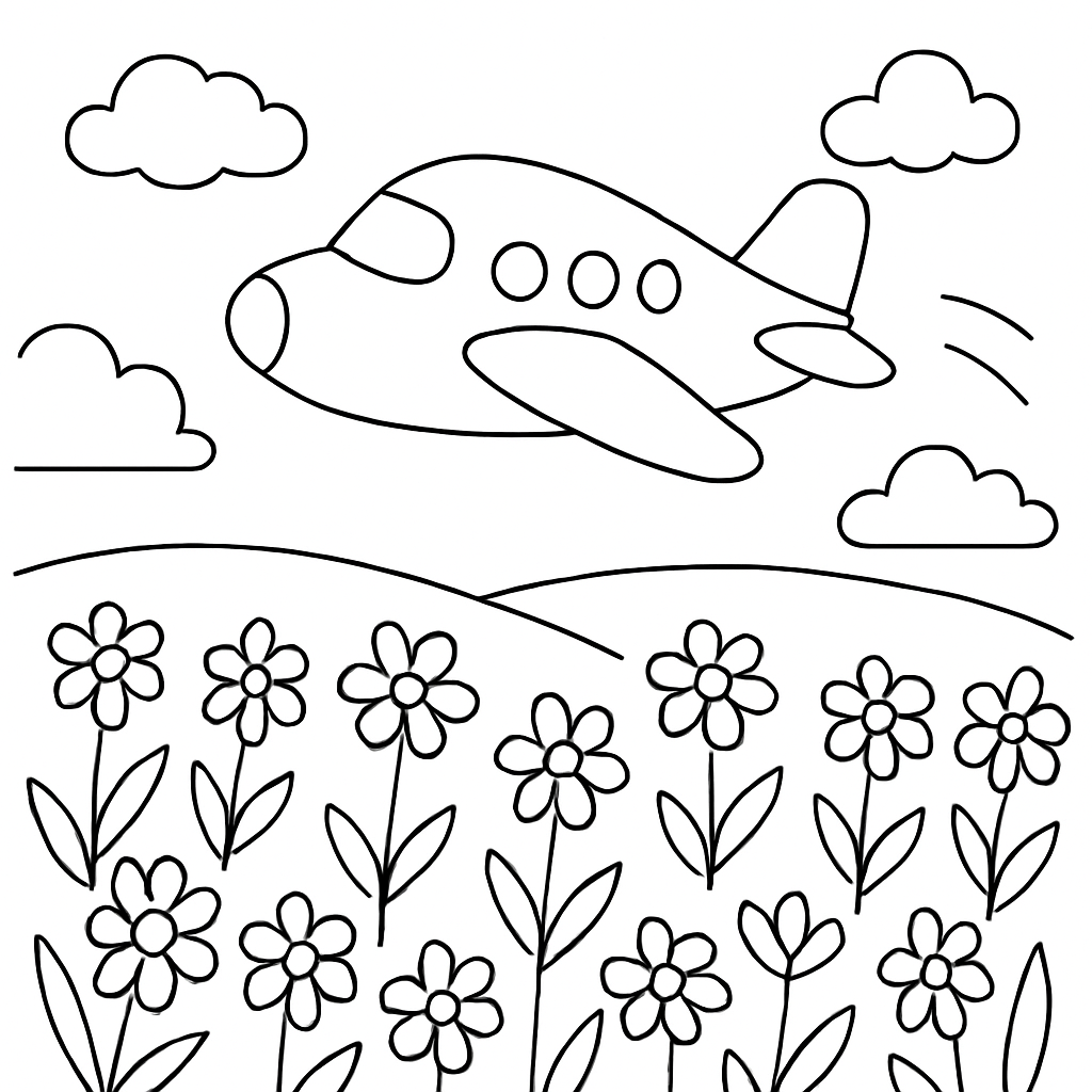 A simple coloring page featuring a small airplane flying over fields of spring flowers. Perfect for kids (4-6) with large, bold outlines for a fun coloring experience.