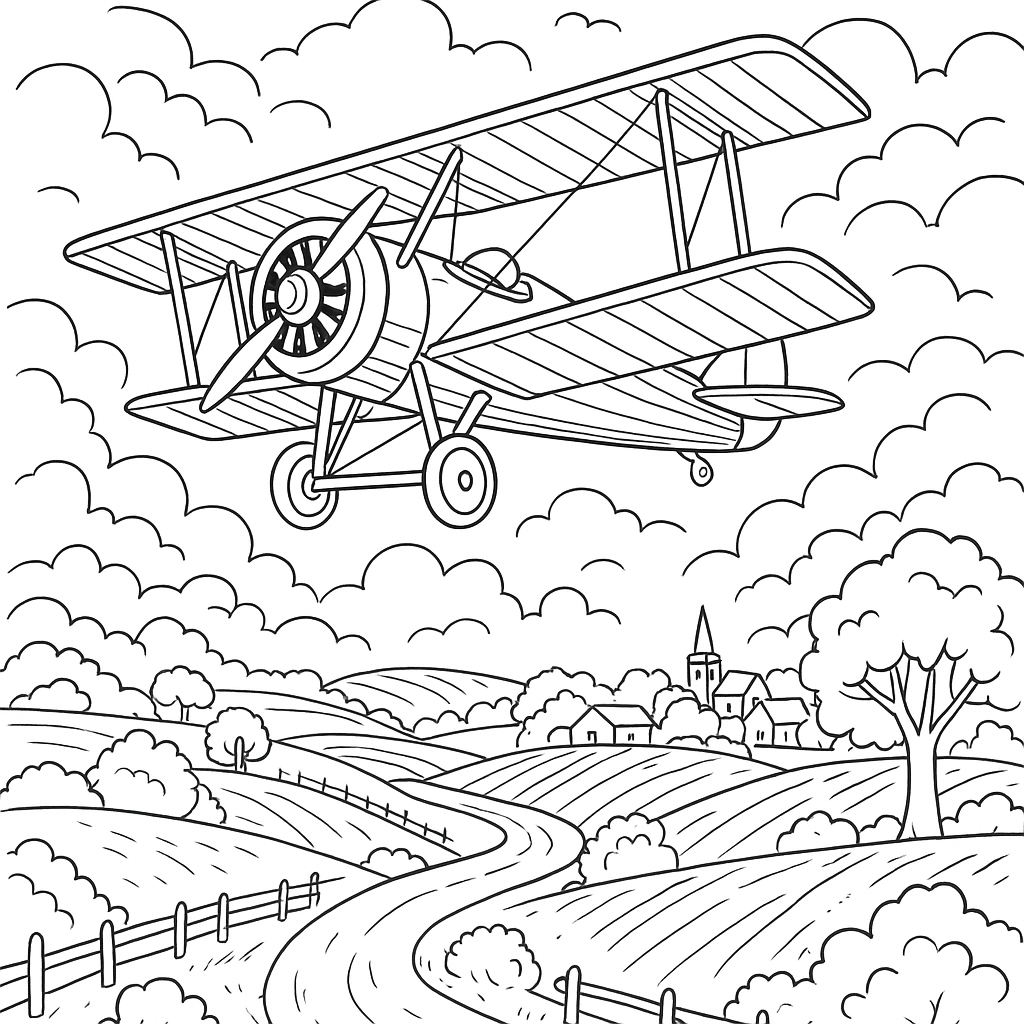 A detailed coloring page featuring a vintage biplane flying over countryside. Perfect for tweens (9-12) with intricate detail for a fun coloring experience.