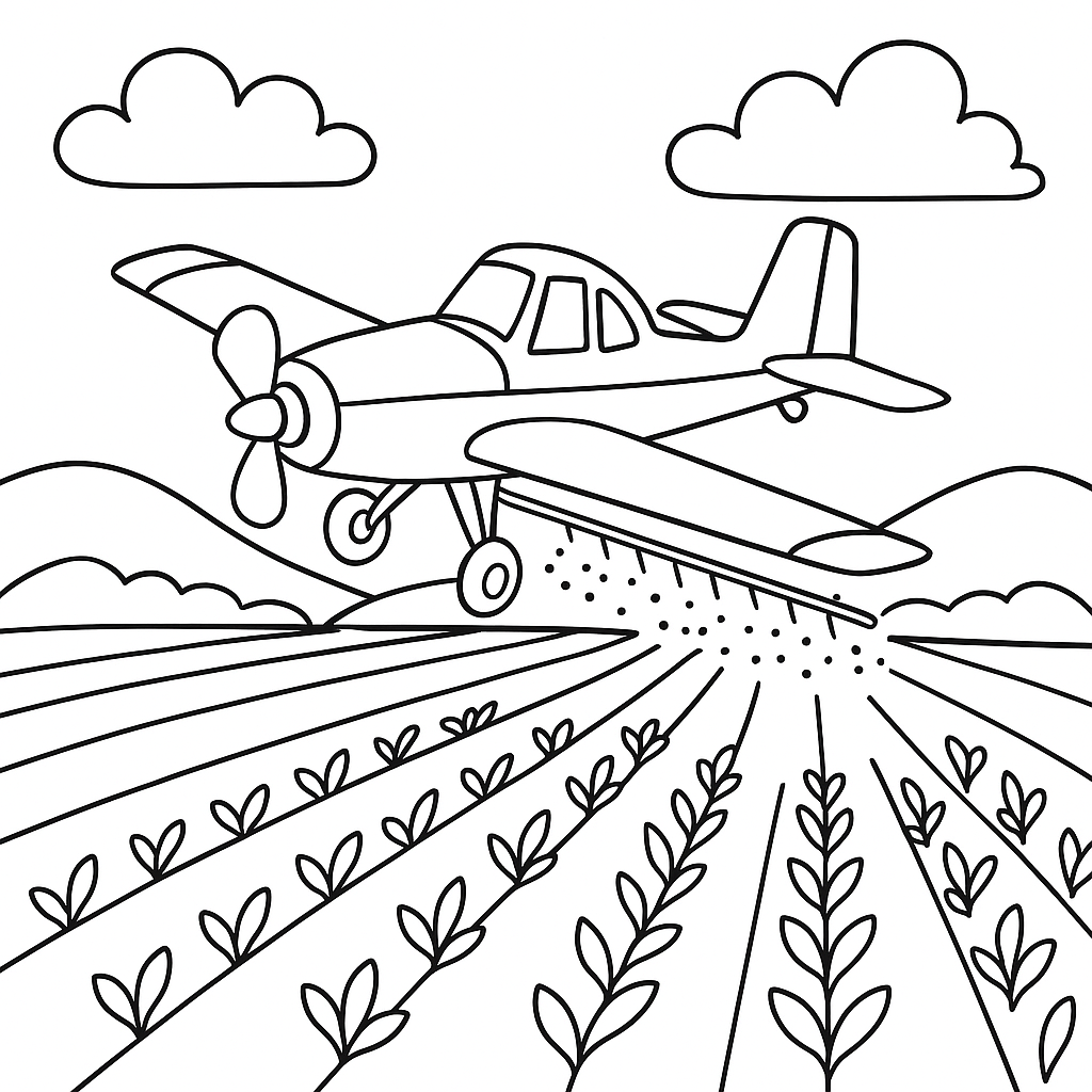 A medium coloring page featuring crop duster plane seeding spring fields. Perfect for kids (6-9) with moderately detailed outlines for a fun coloring experience.