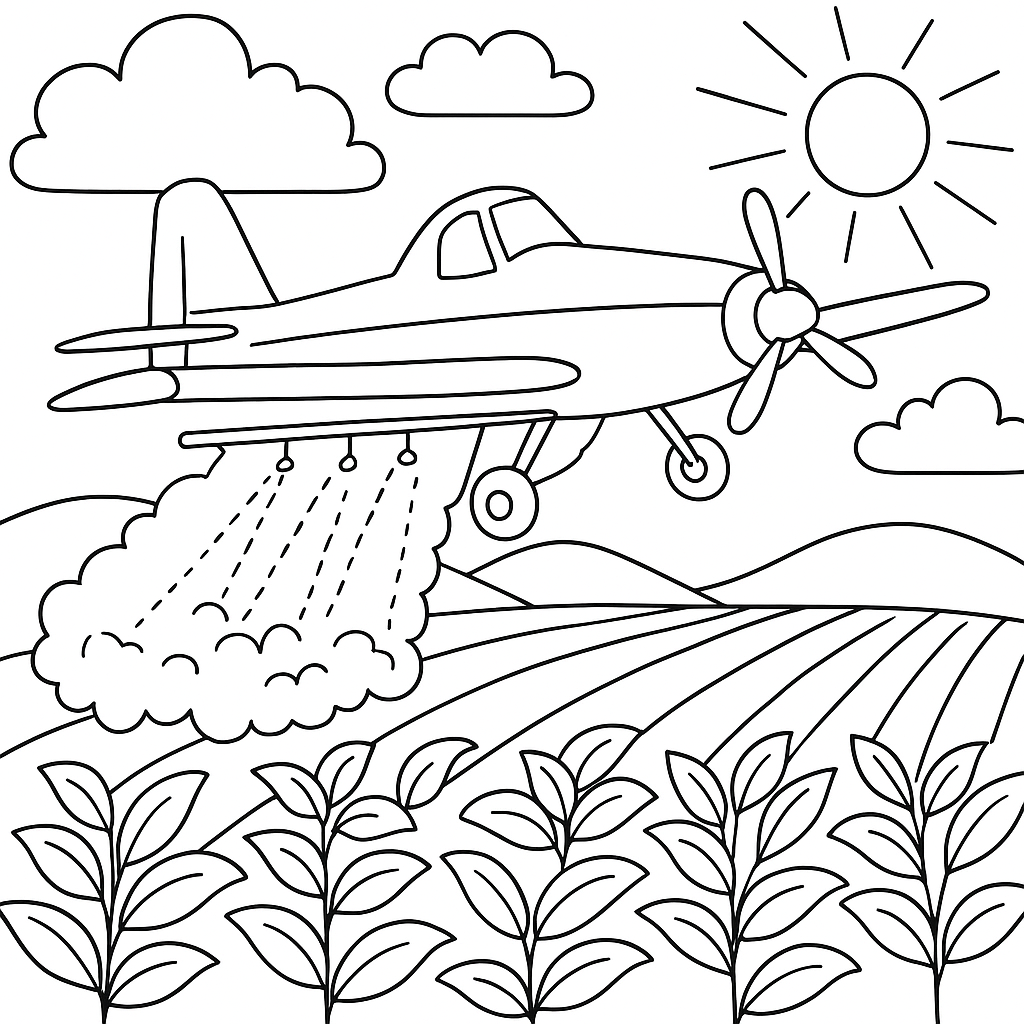 A medium coloring page featuring crop duster plane spraying organic treatment over field. Perfect for kids (6-9) with moderately detailed outlines for a fun coloring experience.