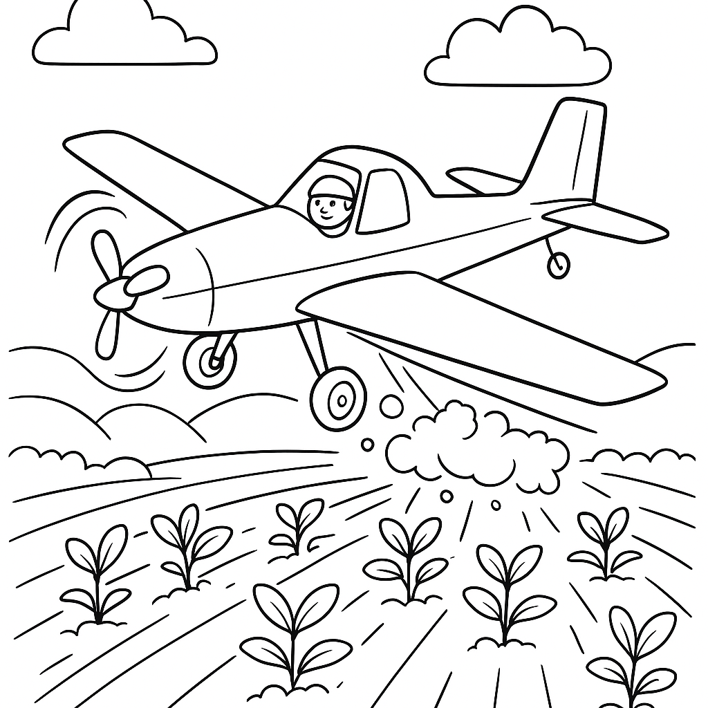 A medium coloring page featuring crop duster spraying organic treatment on spring crops. Perfect for kids (6-9) with moderately detailed outlines for a fun coloring experience.
