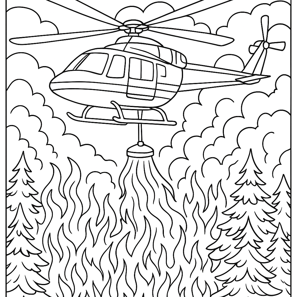 A detailed coloring page featuring helicopter dropping water to fight forest fires. Perfect for tweens (9-12) with intricate detail for a fun coloring experience.