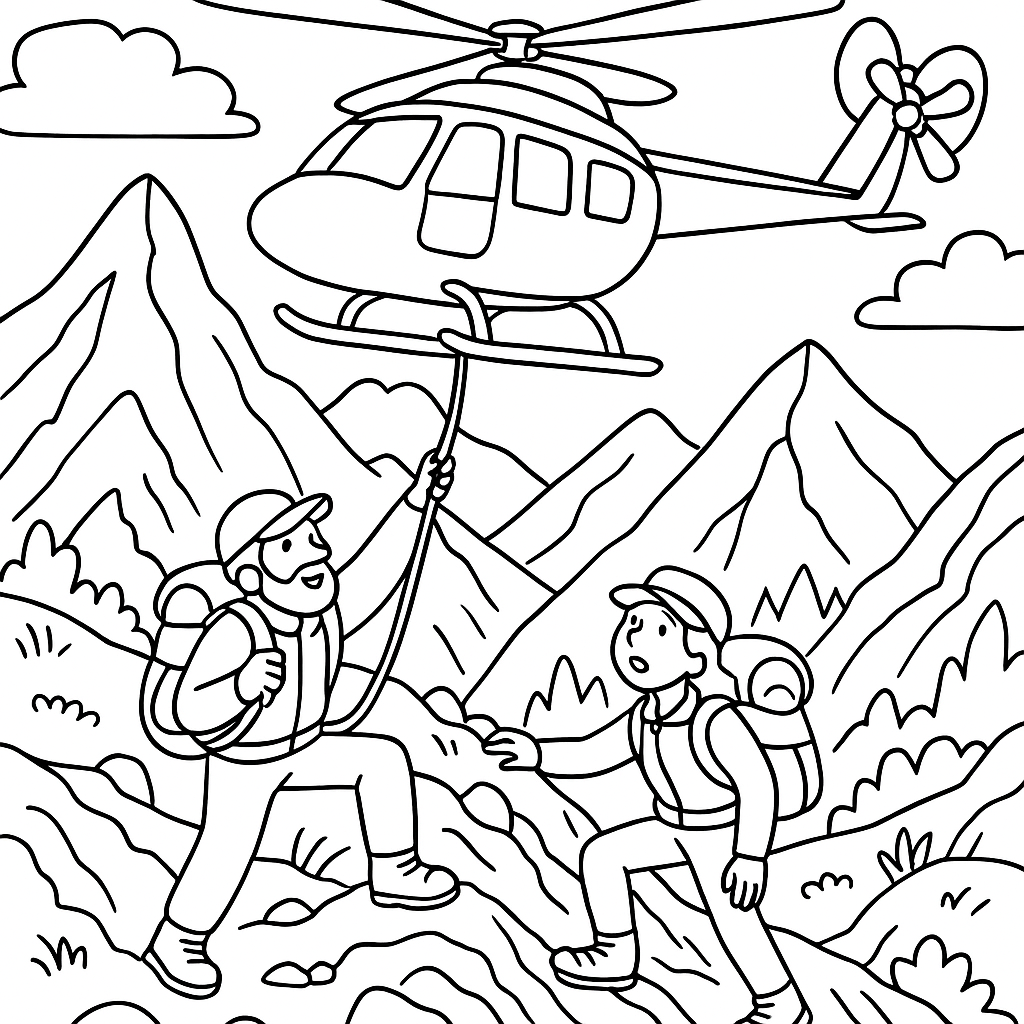 A detailed coloring page featuring helicopter rescuing hikers from mountain. Perfect for kids (6-9) with intricate detail for a fun coloring experience.