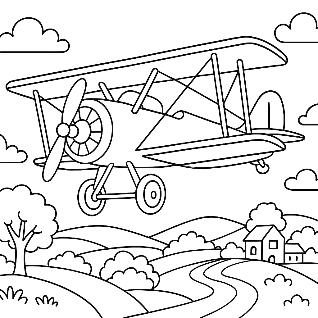 A medium coloring page featuring vintage biplane flying over countryside landscape. Perfect for kids (6-9) with moderately detailed outlines for a fun coloring experience.