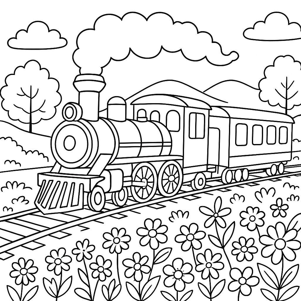A medium coloring page featuring a steam train chugging through blooming countryside. Perfect for kids (6-9) with moderately detailed outlines for a fun coloring experience.