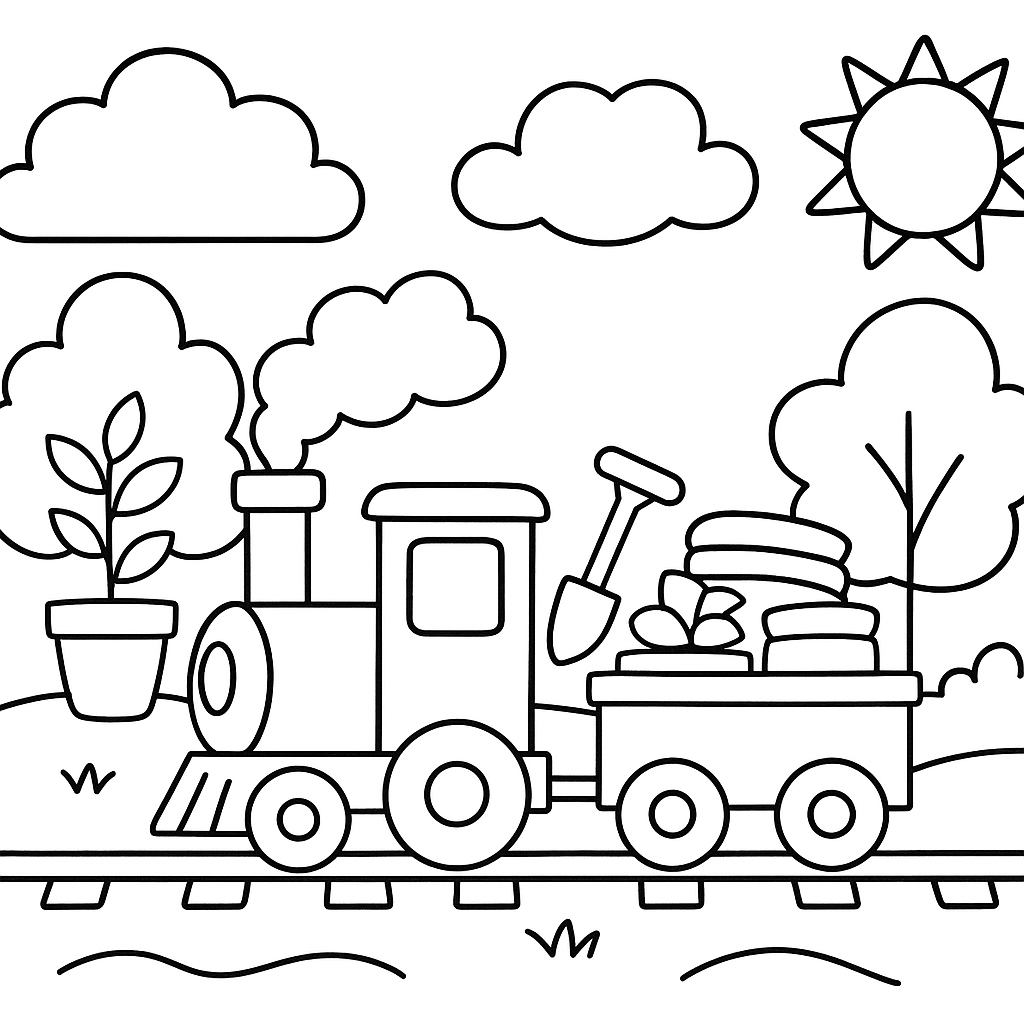 A simple coloring page featuring a train carrying supplies for building new parks and gardens. Perfect for kids (4-6) with large, bold outlines for a fun coloring experience.