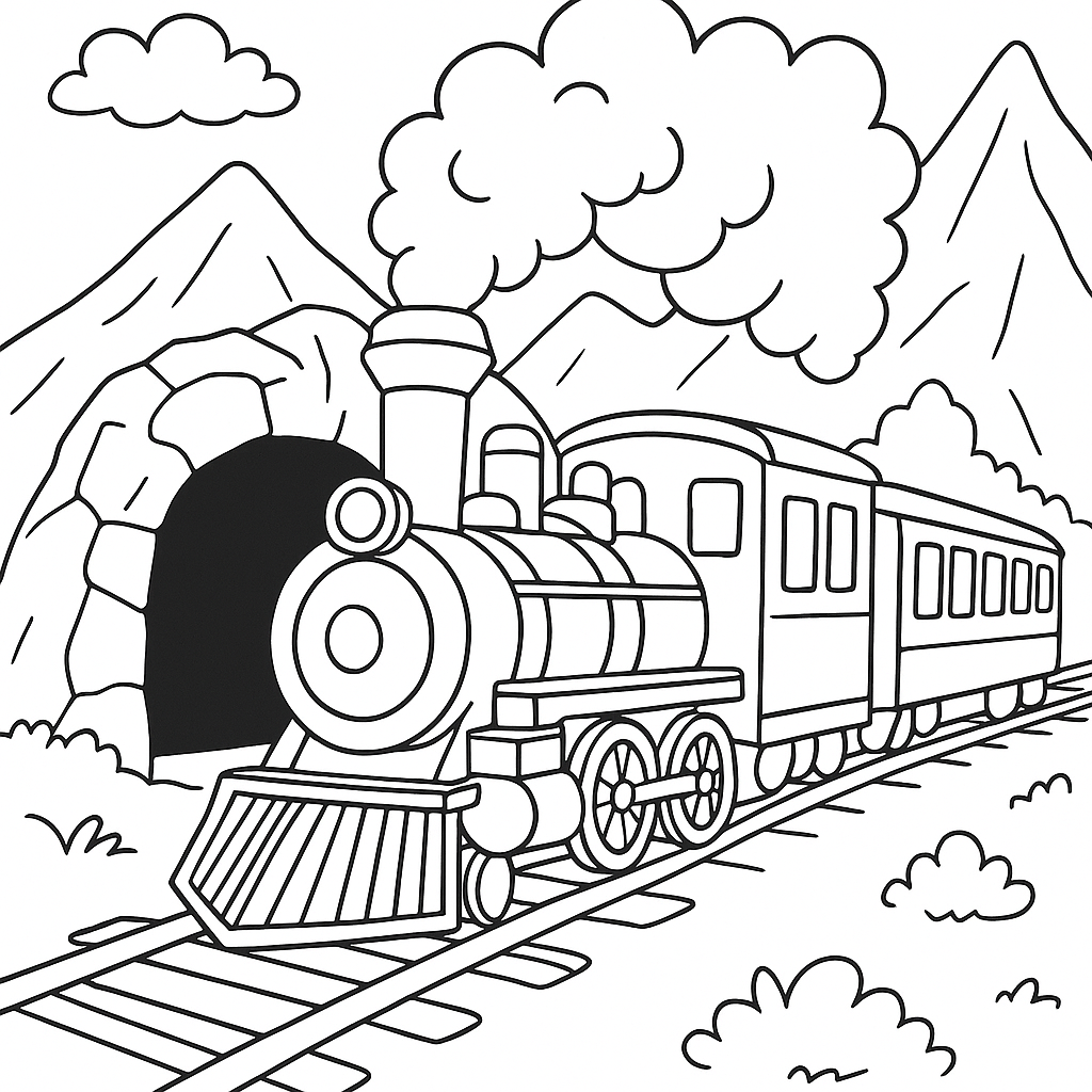 A medium coloring page featuring steam locomotive chugging through mountain tunnel. Perfect for kids (6-9) with moderately detailed outlines for a fun coloring experience.
