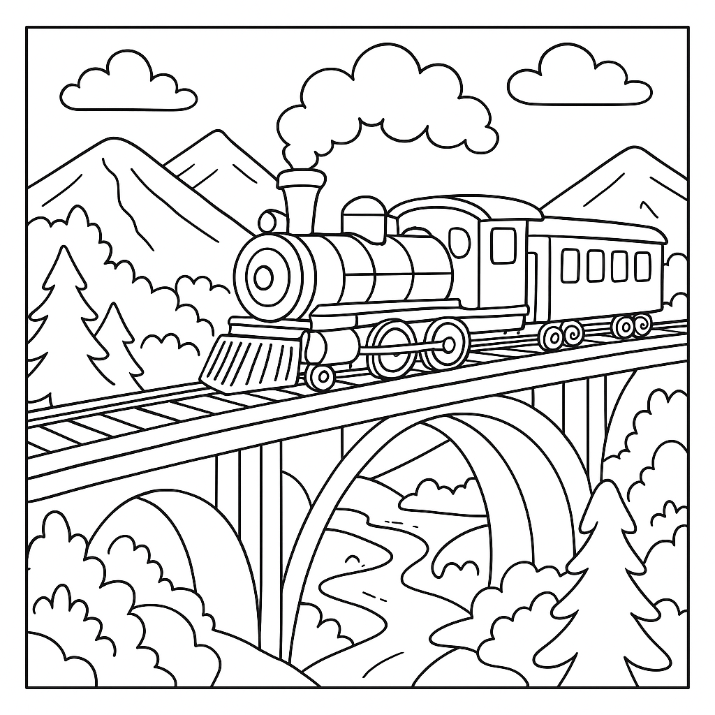 A medium coloring page featuring steam locomotive crossing mountain bridge with valley below. Perfect for kids (6-9) with moderately detailed outlines for a fun coloring experience.