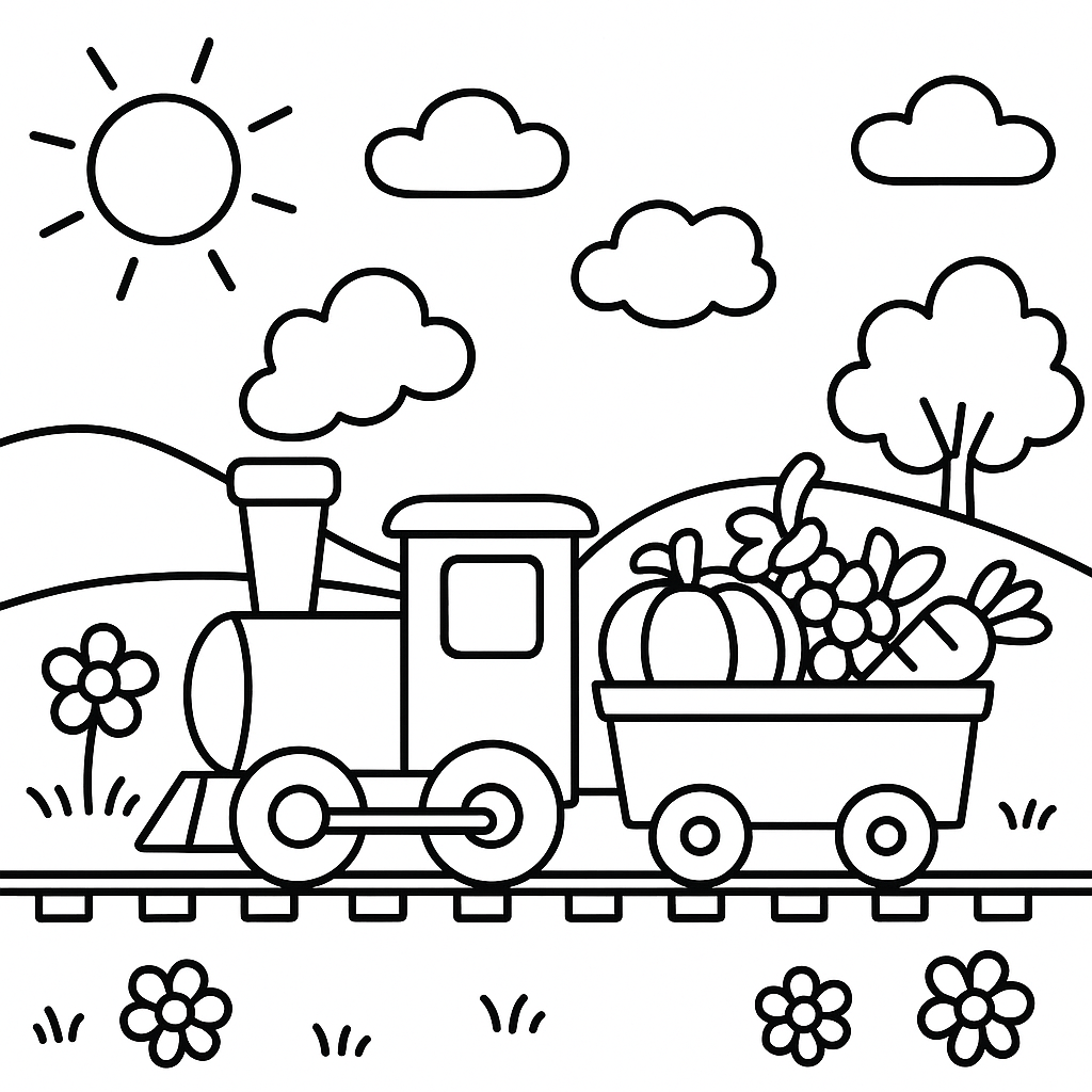 A simple coloring page featuring train carrying fresh produce through spring countryside. Perfect for toddlers (2-4) with large, bold outlines for a fun coloring experience.