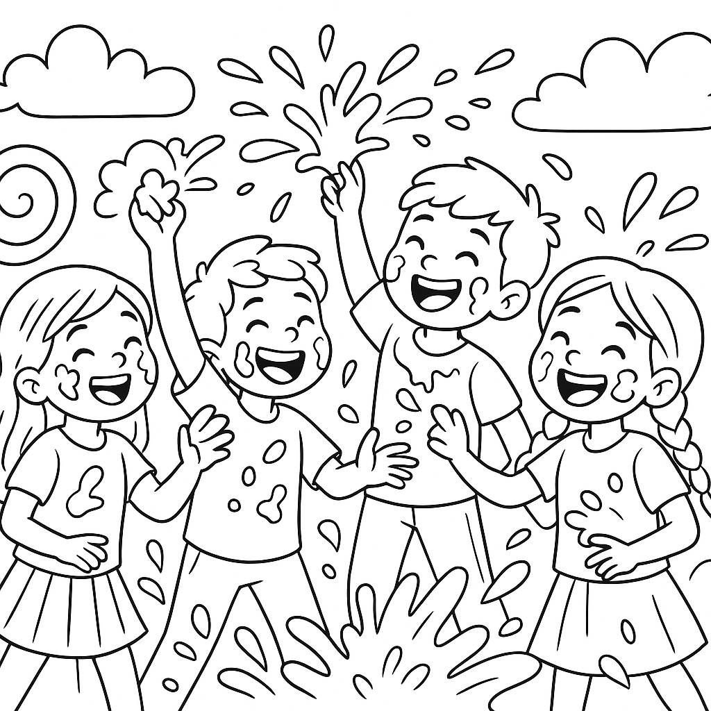 A medium coloring page featuring children celebrating Holi festival with colorful powder and joy. Perfect for kids (6-9) with moderately detailed outlines for a fun coloring experience.