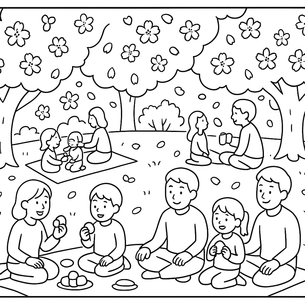 A medium coloring page featuring Japanese hanami cherry blossom festival with families picnicking. Perfect for kids (6-9) with moderately detailed outlines for a fun coloring experience.