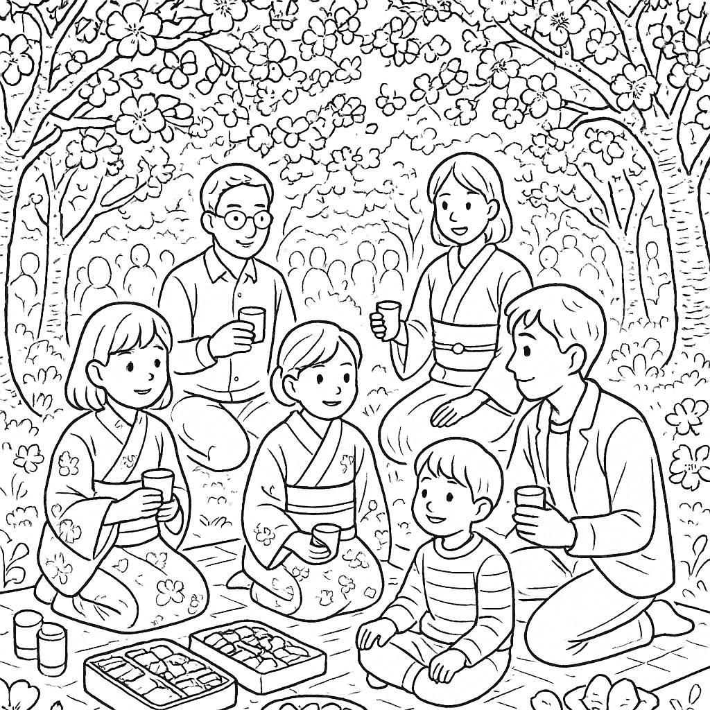 A detailed coloring page featuring Japanese hanami cherry blossom viewing party. Perfect for tweens (9-12) with intricate detail for a fun coloring experience.