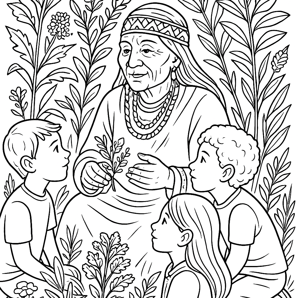 A detailed coloring page featuring indigenous elder teaching children about plant medicines. Perfect for tweens (9-12) with intricate detail for a fun coloring experience.
