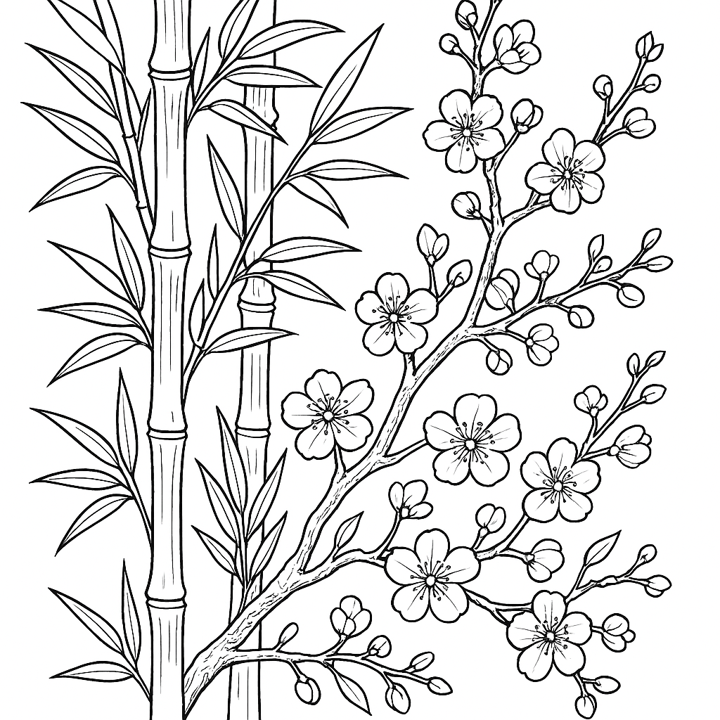 A detailed coloring page featuring Chinese brush painting of bamboo and spring blossoms. Perfect for tweens (9-12) with intricate detail for a fun coloring experience.