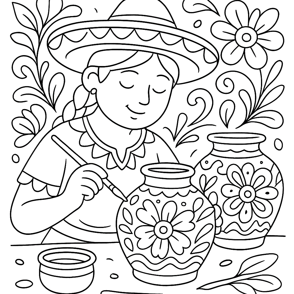 A medium coloring page featuring mexican pottery painting with colorful designs. Perfect for kids (6-9) with moderately detailed outlines for a fun coloring experience.