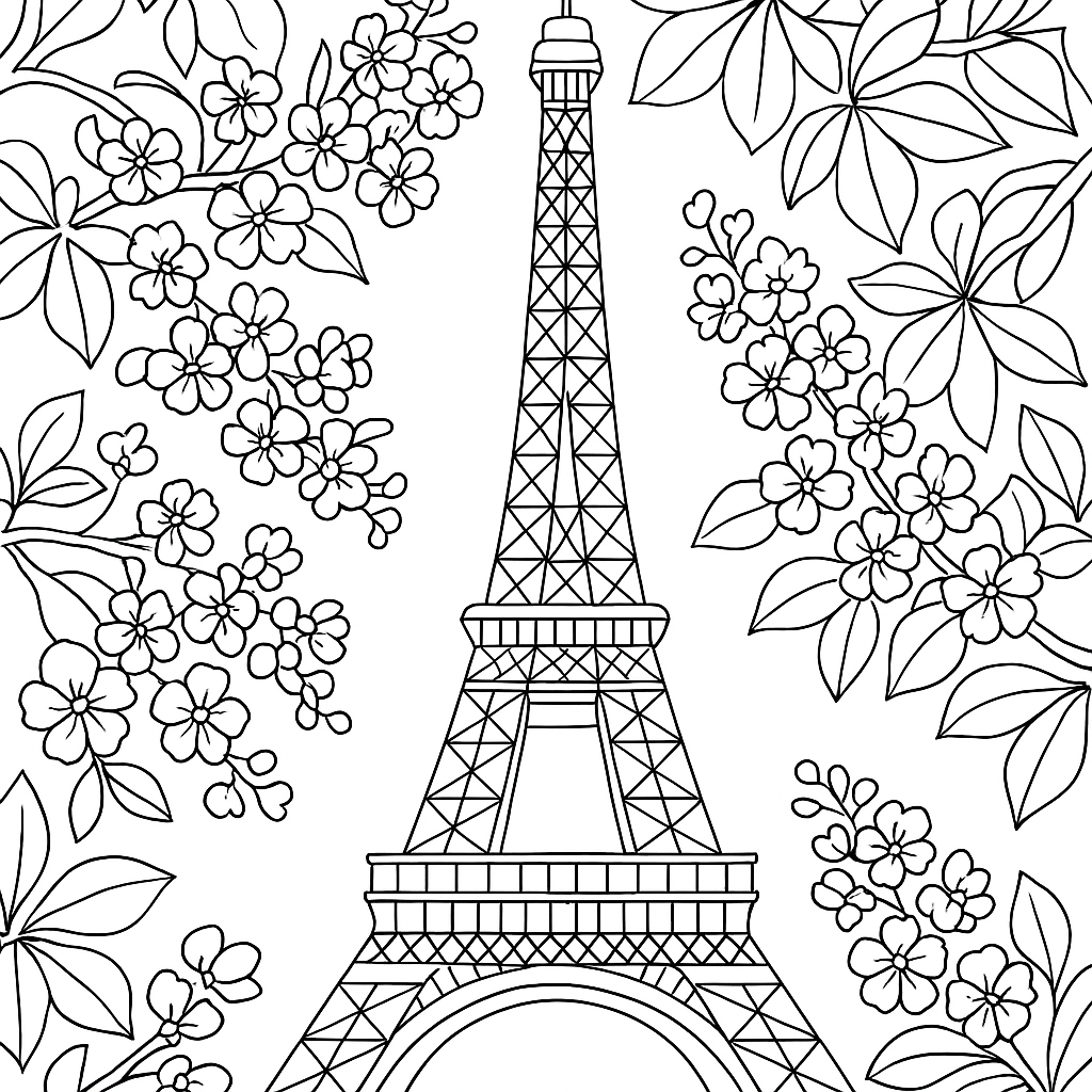 A medium coloring page featuring Eiffel Tower surrounded by spring chestnut blossoms. Perfect for kids (6-9) with moderately detailed outlines for a fun coloring experience.