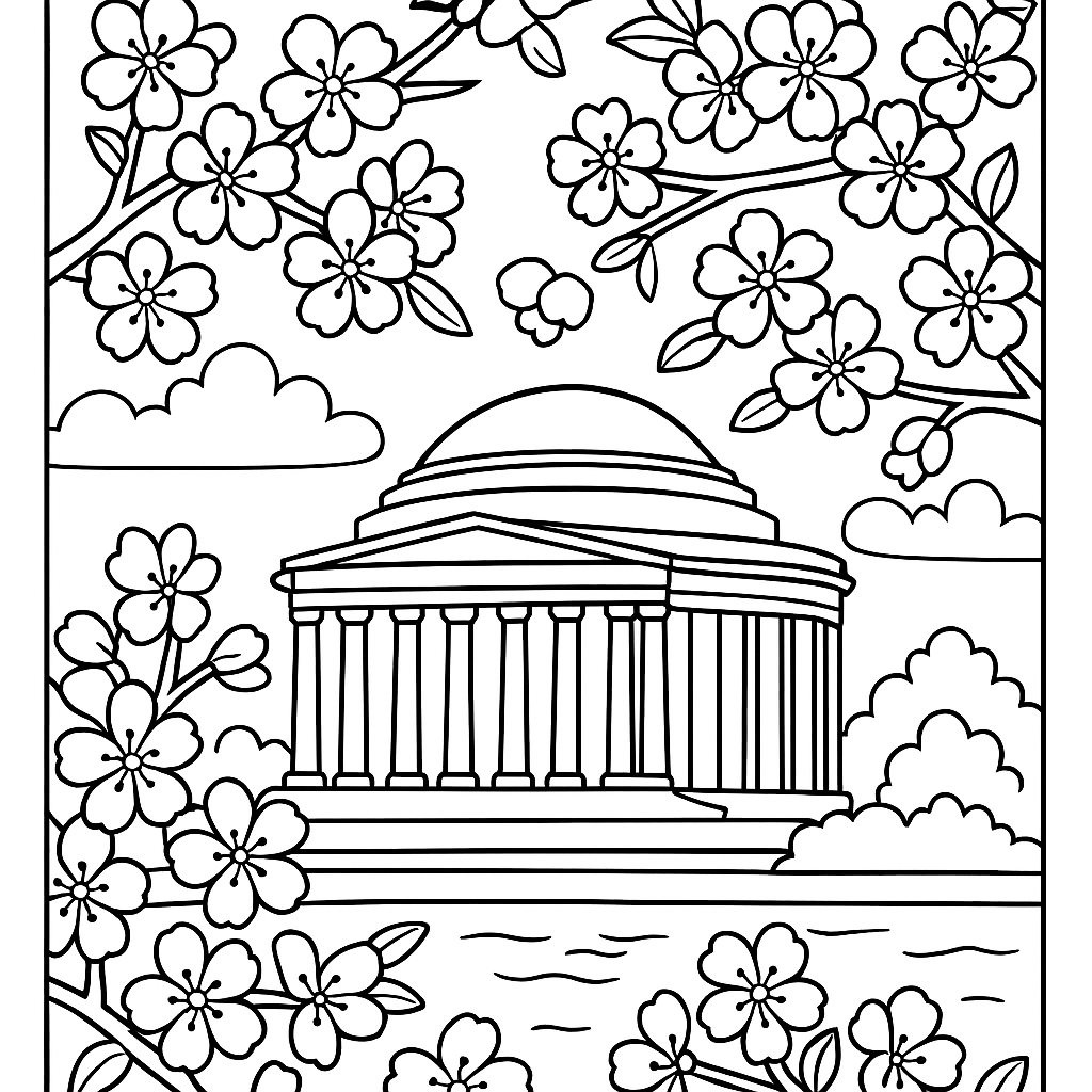 A medium coloring page featuring Washington D.C. cherry blossoms around the Jefferson Memorial. Perfect for kids (6-9) with moderately detailed outlines for a fun coloring experience.